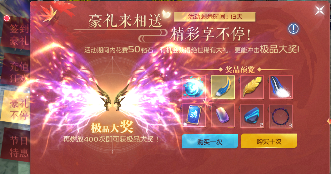 活动规则:活动期间花费50钻石抽奖有机会获得极品大奖