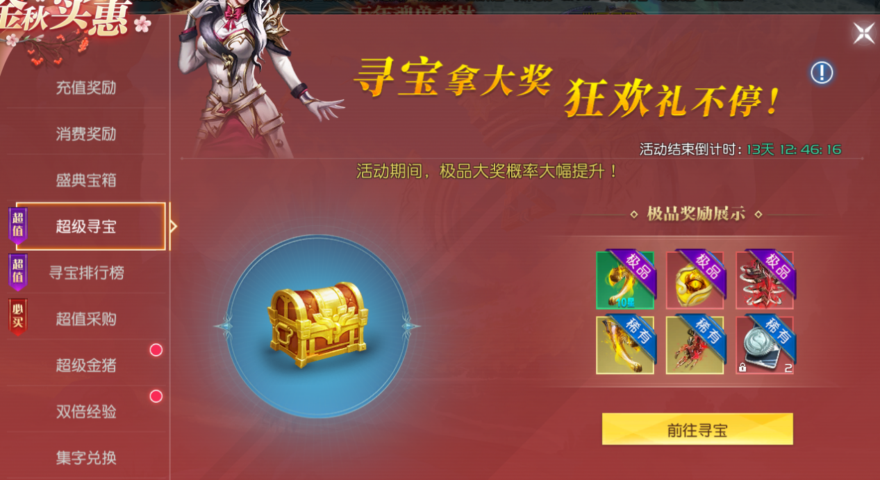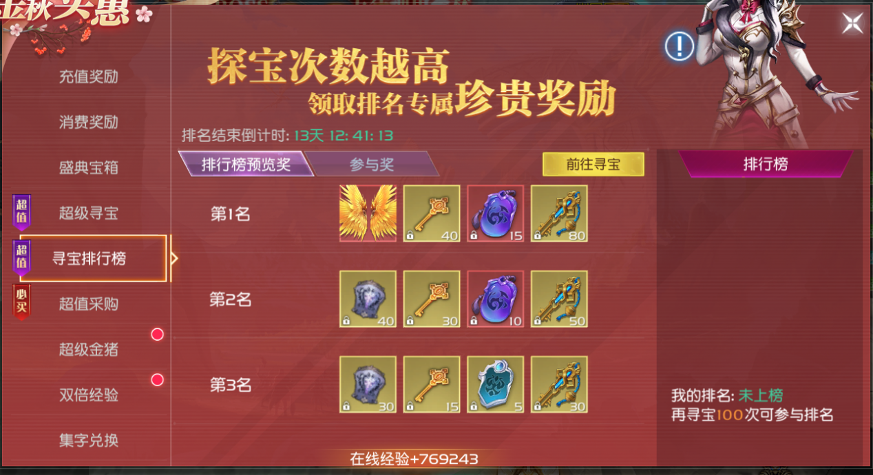 活动规则:活动期间寻宝次数达到指定要求即可参与排行,活动结束后邮件发放排行奖励