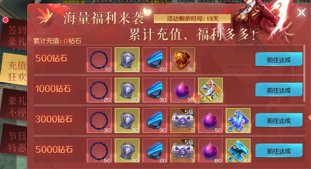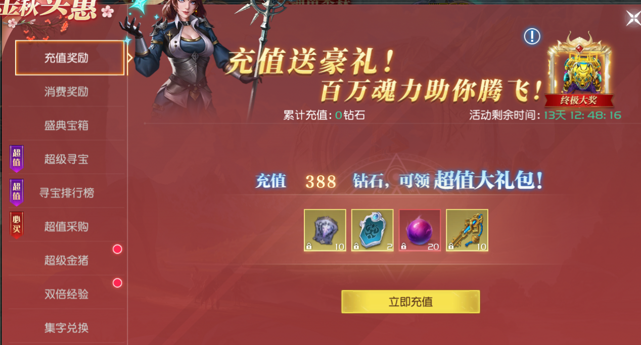 活动规则:活动期间充值钻石达到指定数量可获得奖励一份