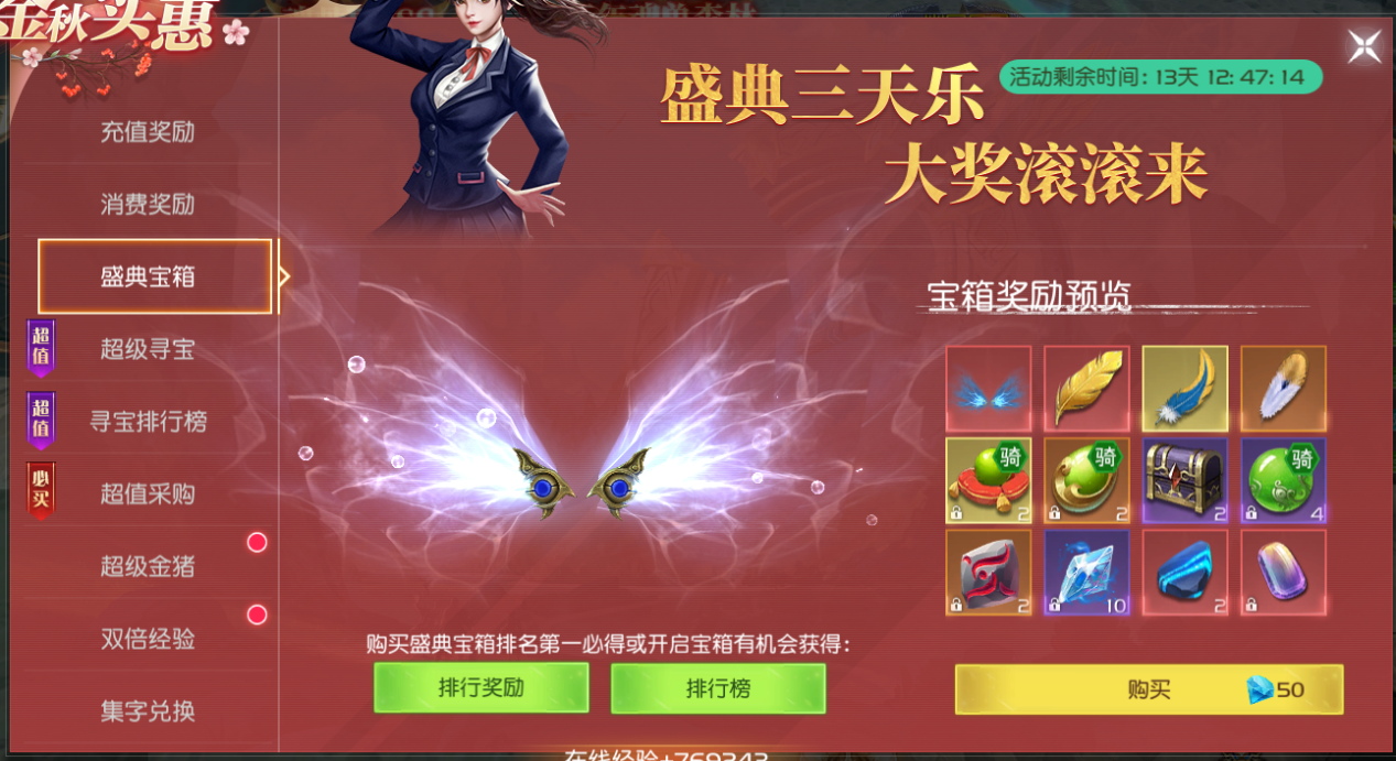 活动规则:活动期间购买盛典宝箱奖励有概率获得大奖或达到排行榜第一必获得大奖