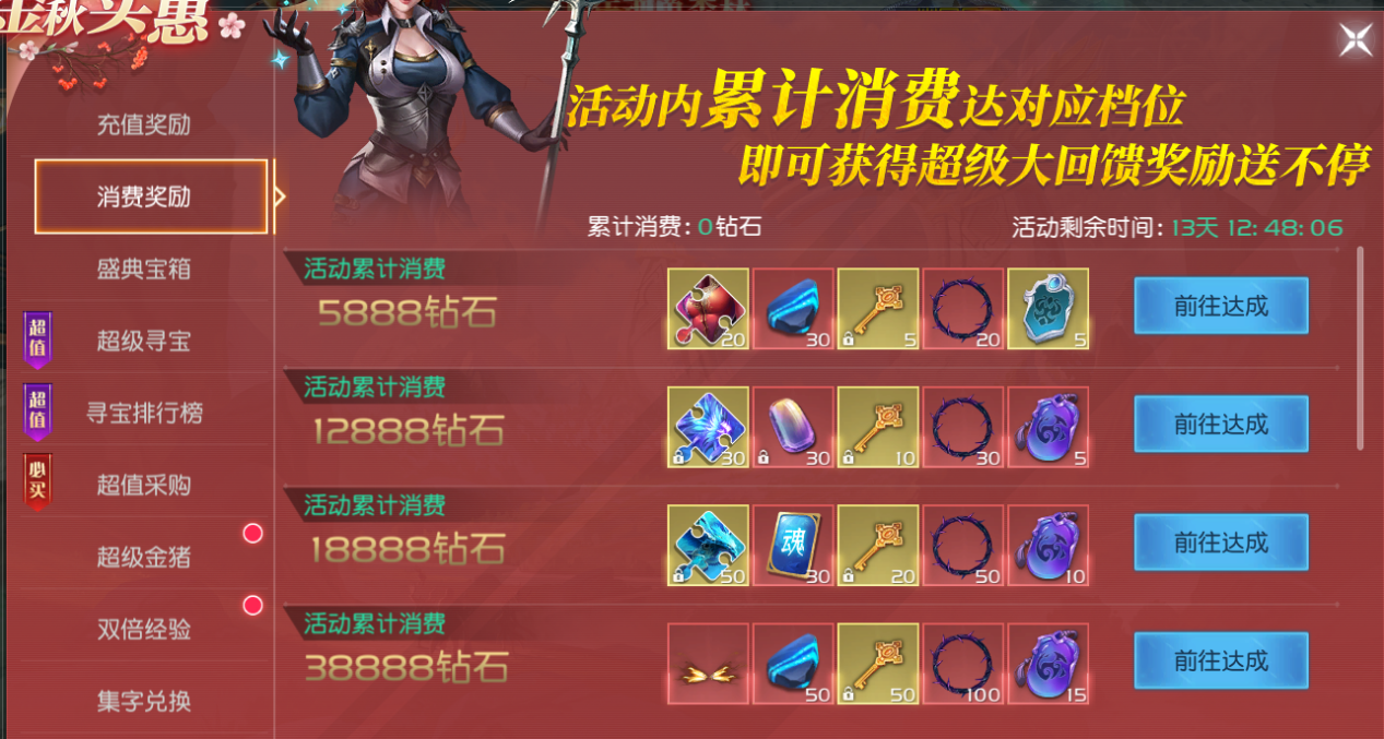 活动规则:活动期间消费钻石达到指定数量可获得奖励一份