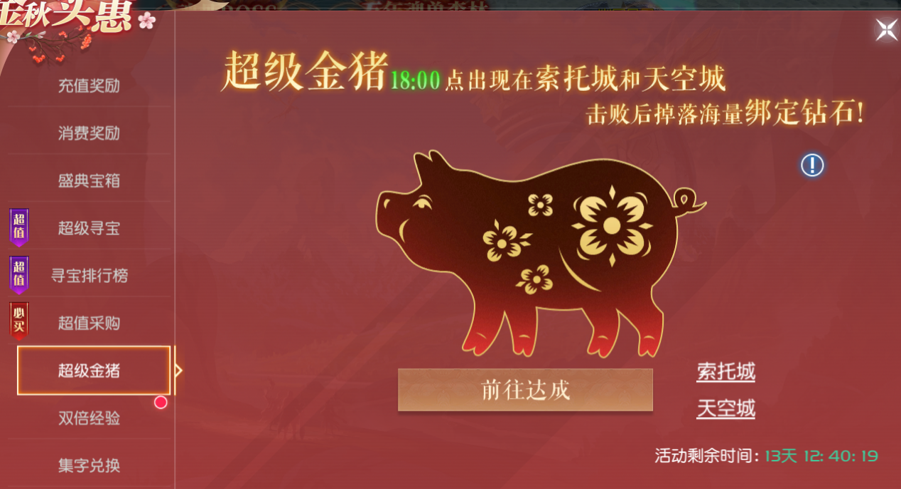 活动规则:活动期间击杀超级金猪可掉落大量绑钻奖励
